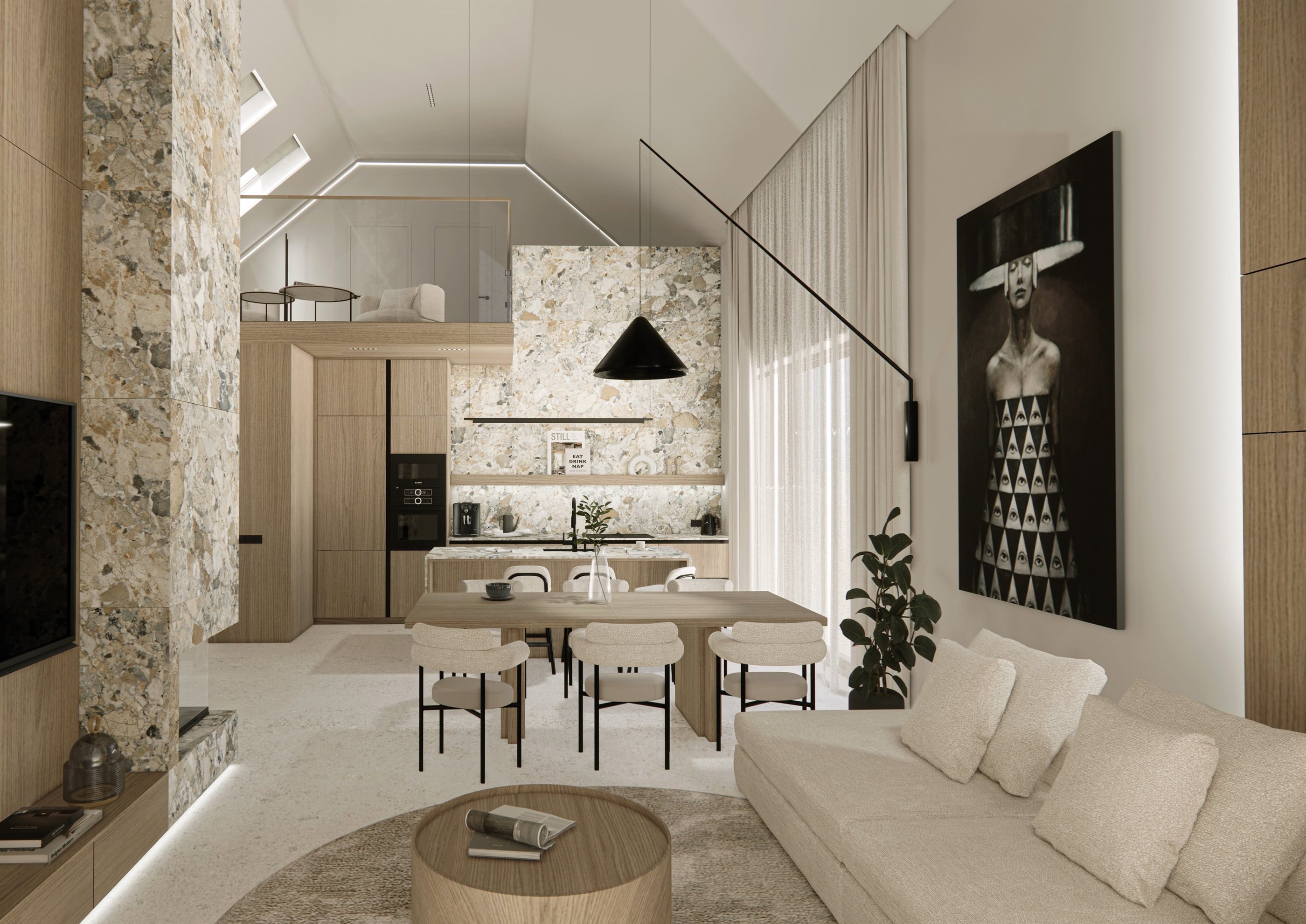 Svetainė, valgomasis ir virtuvė sujungti į šviesos kupiną bendrą erdvę, kurioje dera modernios linijos ir šiltos tekstūros. Miegamajame išlaikoma ta pati stilistinė kryptis – minkšti audiniai, integruotas apšvietimas ir švarios formos kuria jaukią, harmoningą atmosferą. Vonios kambaryje tęsiamas natūralių medžiagų ir šviesių atspalvių dialogas, užtikrinantis nuoseklų ir estetiškai vientisą visų namų charakterį.