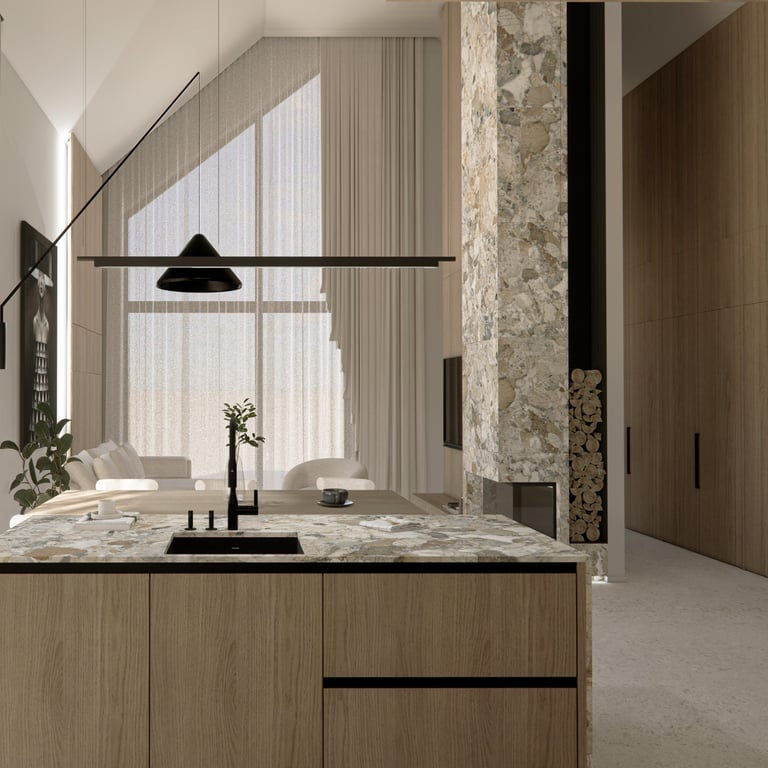 Interjere vyrauja šviesi, natūrali spalvinė gama – šilti smėlio, medžio ir kreminiai tonai, kuriuos papildo išraiškinga akmens tekstūra. Būtent akmens raštas virtuvės sienoje ir židinio zonoje tampa stipriausiu vizualiniu akcentu, suteikiančiu erdvei charakterio ir subtilios prabangos pojūtį. Natūrali mediena balduose ir sienų plokštumose kuria vientisą, estetiškai subalansuotą foną.