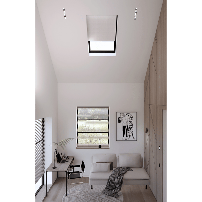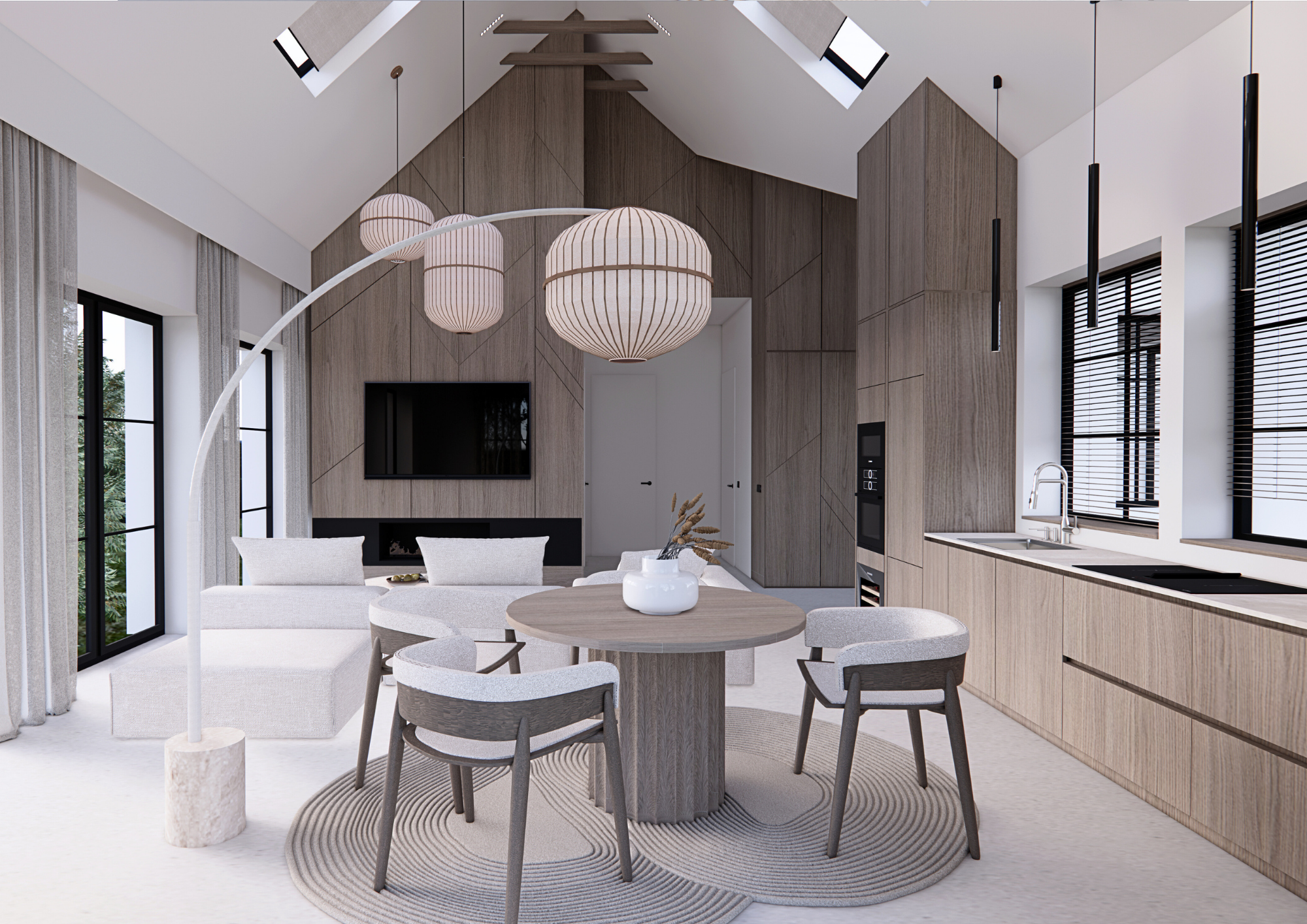 Interjeras pasižymi subtilia, prislopinta spalvine gama, kurioje dominuoja šilti pilkšvi, smėlio ir natūralios medienos tonai. Aukštos lubos ir stogo langai leidžia šviesai laisvai tekėti per erdvę, išryškindami tekstūrų bei paviršių gylį. Vertikalios medžio plokštumos ir grafiški fasadų raštai suteikia interjerui struktūros, o švelnūs baldų siluetai sukuria balansą tarp architektūriškumo ir jaukumo.