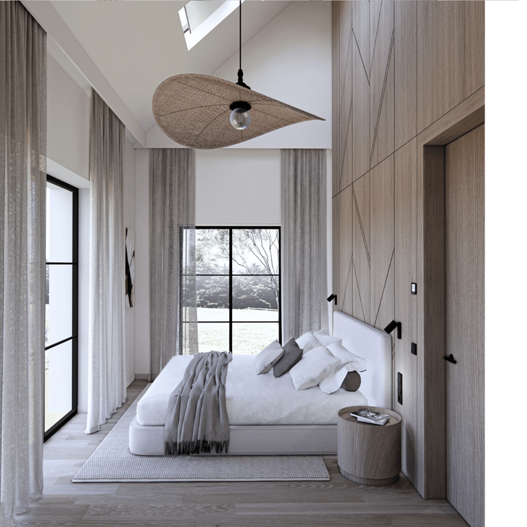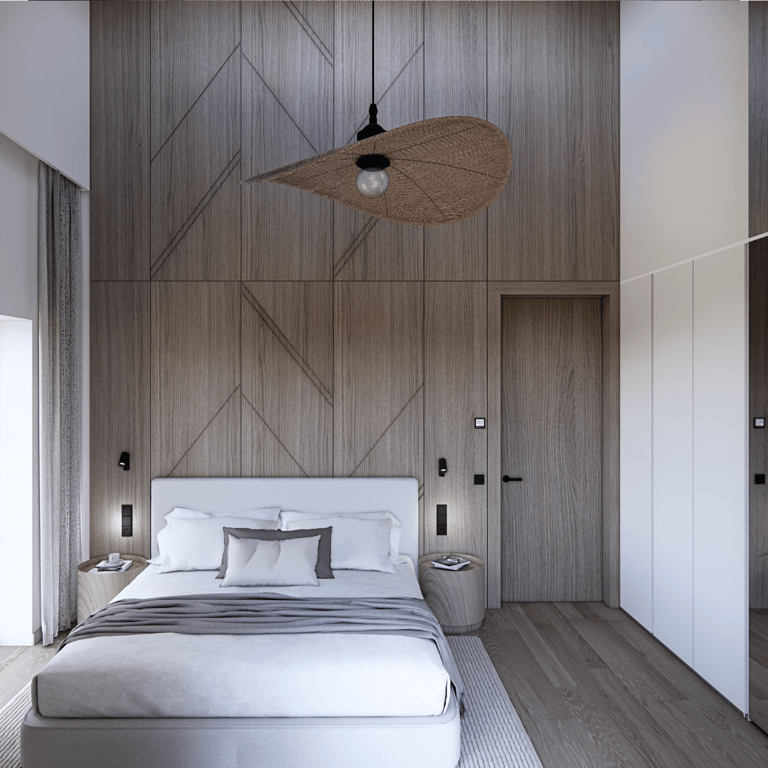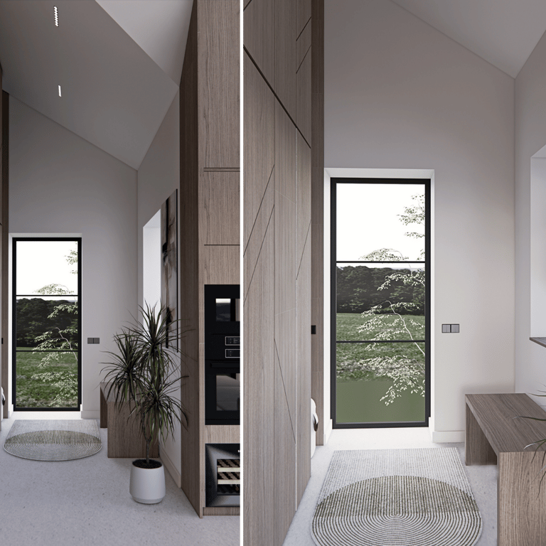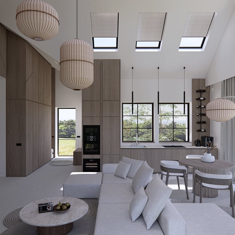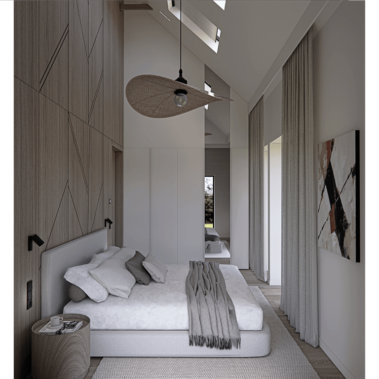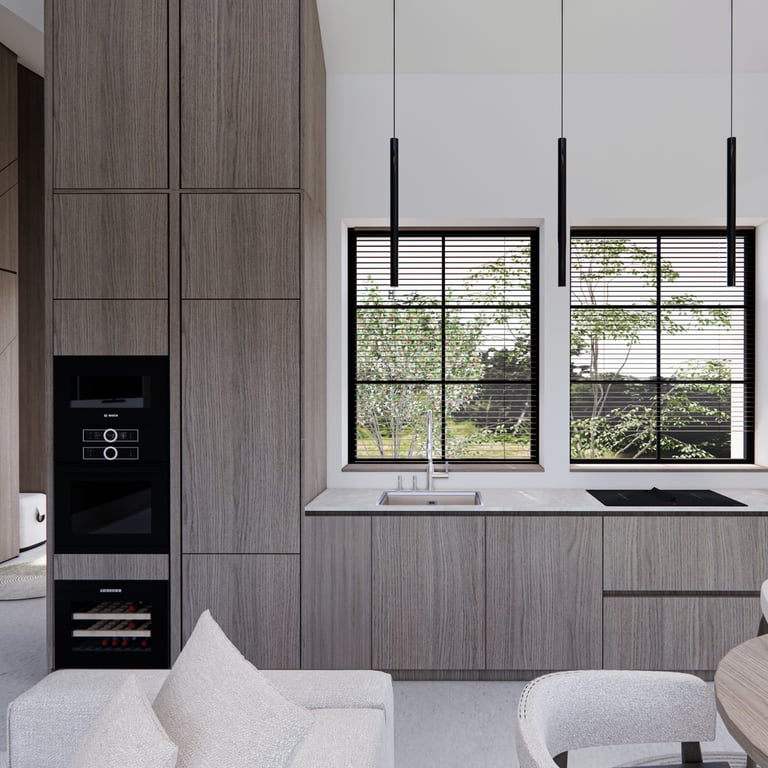 Bendra svetainės, virtuvės ir valgomojo zona formuojama kaip vientisa, atvira erdvė, kurioje natūralios medžiagos dera su moderniomis, aiškiomis linijomis. Pakabinami šviestuvai tampa išraiškingu akcentu, pabrėžiančiu patalpos aukštį ir proporcijas. Miegamajame išlaikoma ta pati estetinė kryptis – ramūs tonai, integruotas apšvietimas ir medžio plokštumos kuria harmoningą, vizualiai subalansuotą namų aplinką.