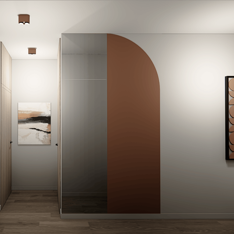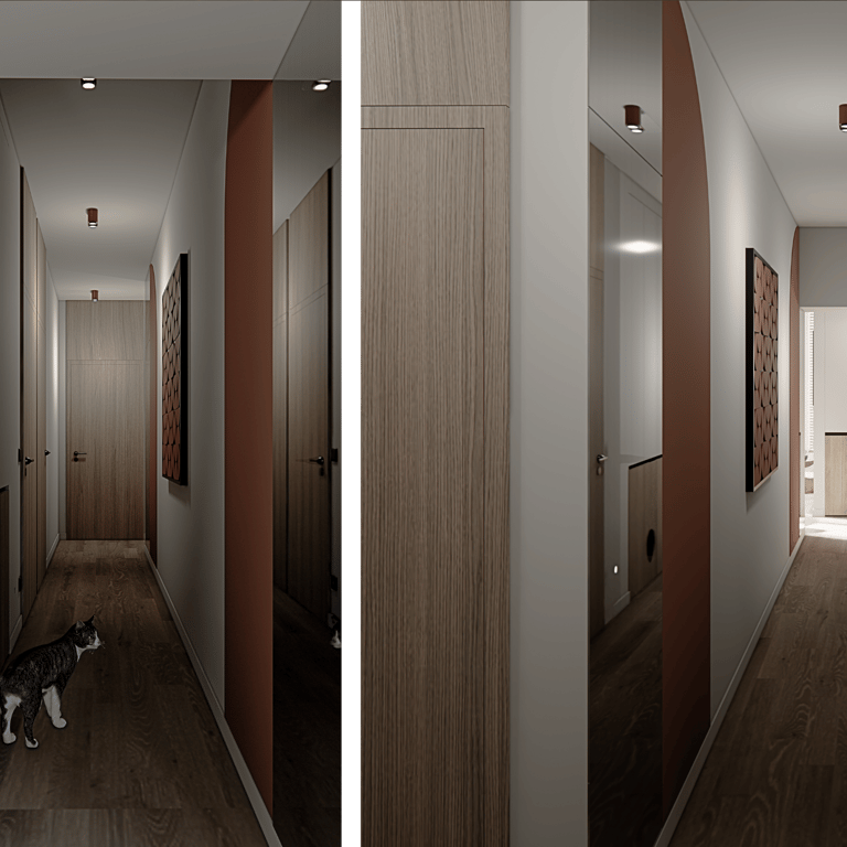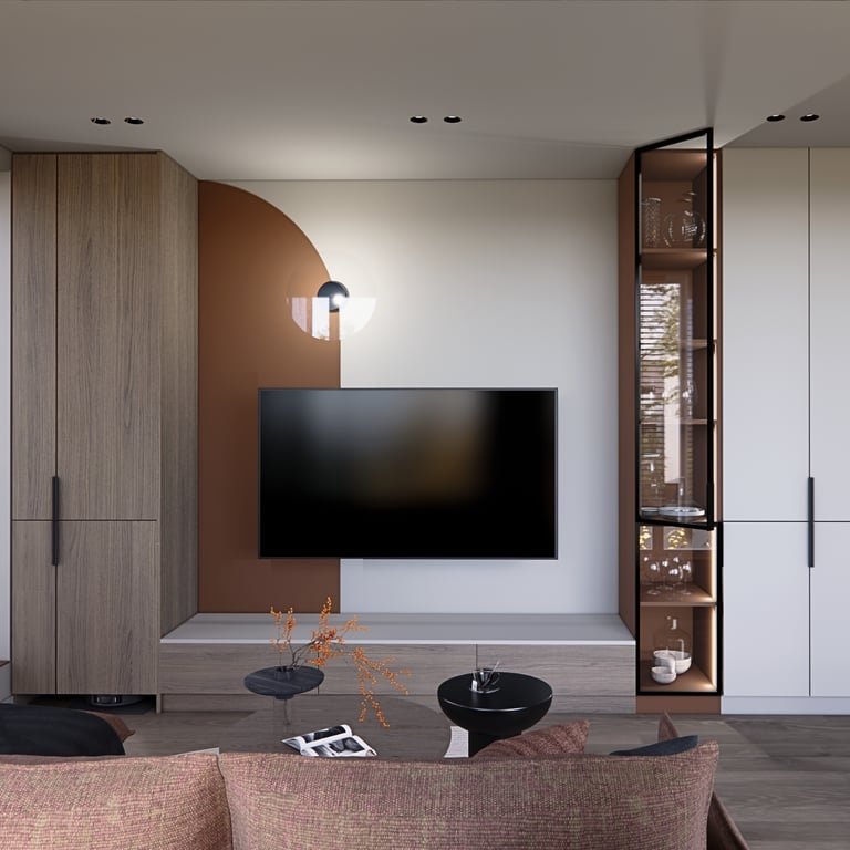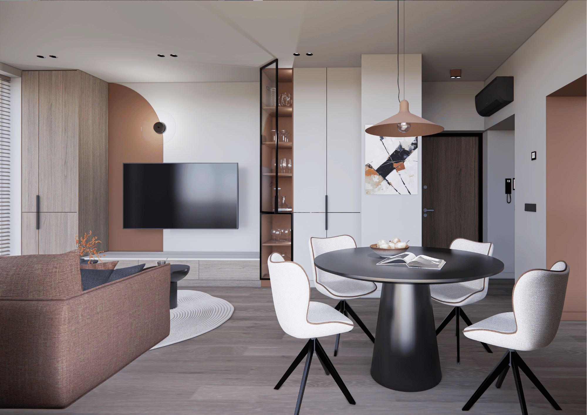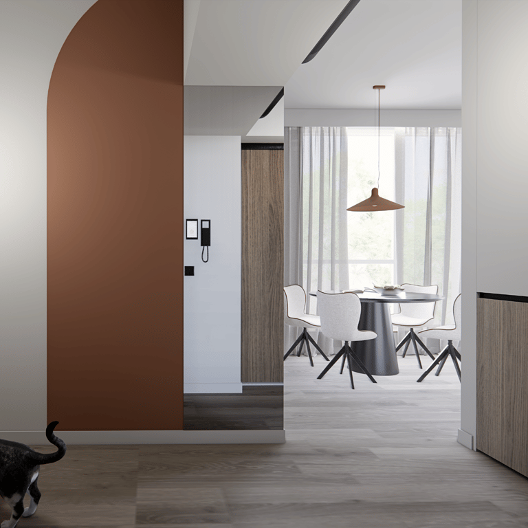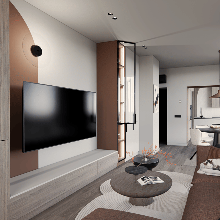 Interjeras išsiskiria šilta žemės tonų palete, kurioje dominuoja natūrali mediena, šviesūs neutralūs atspalviai ir viena stipriausių detalių – plytų terakotos spalva. Šis ryškesnis akcentas subtiliai įkomponuotas sienų plokštumose ir balduose, suteikdamas erdvei charakterio bei vizualinės energijos. Lenkta forma ir arkos motyvas tampa pagrindine kompozicine ašimi – jie pasikartoja nišose, balduose ir sienų sprendimuose, kurdami vientisą bei atpažįstamą interjero ritmą.