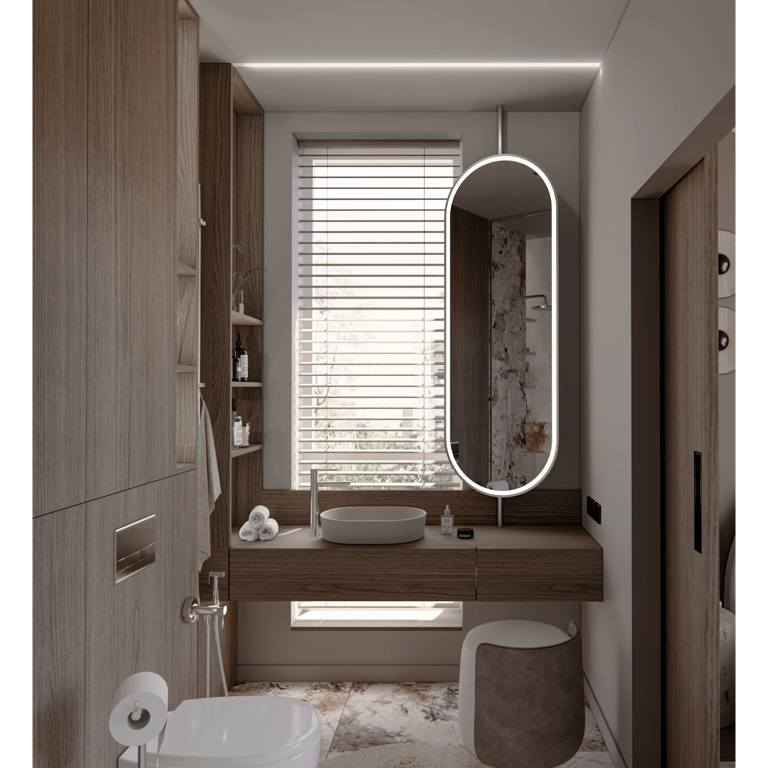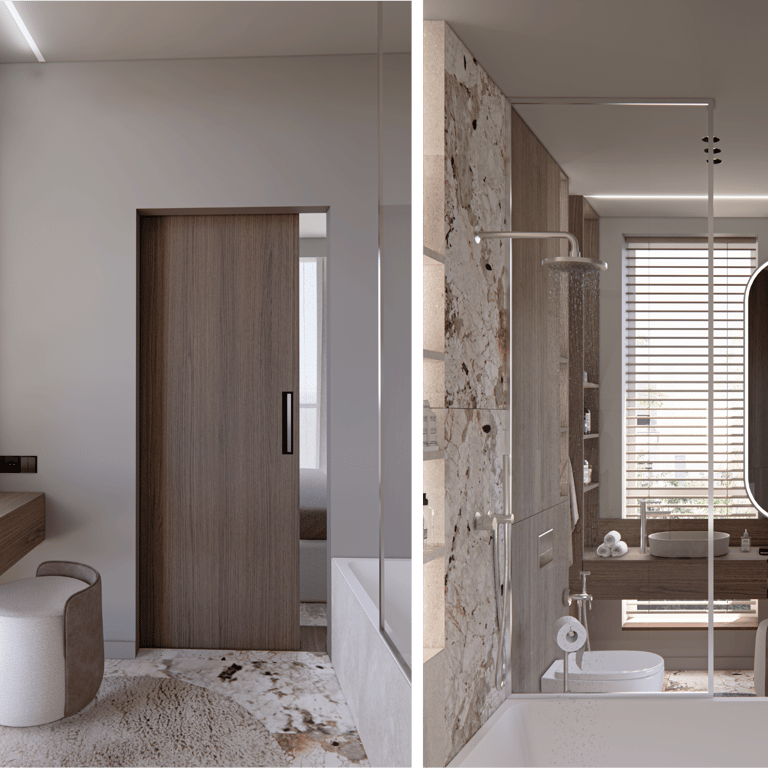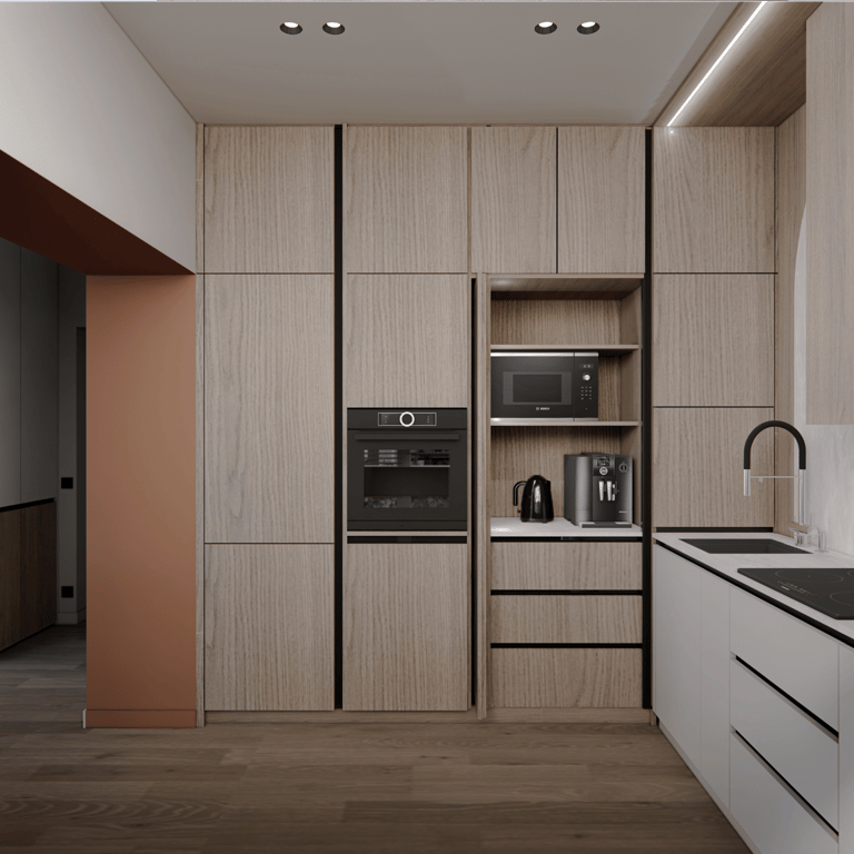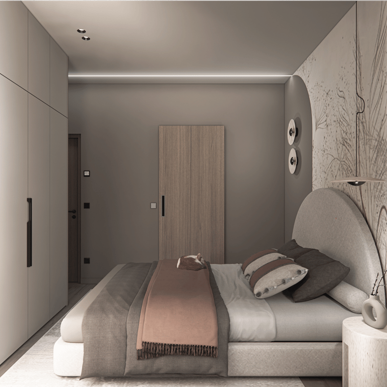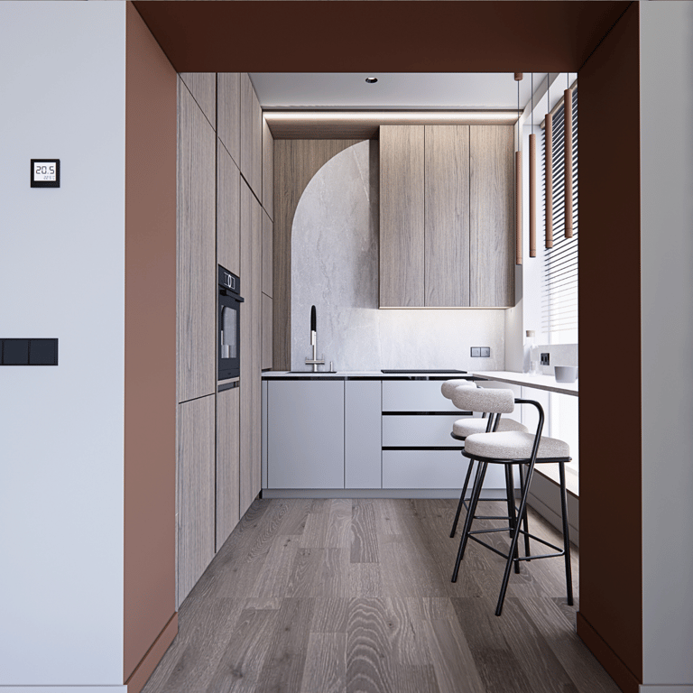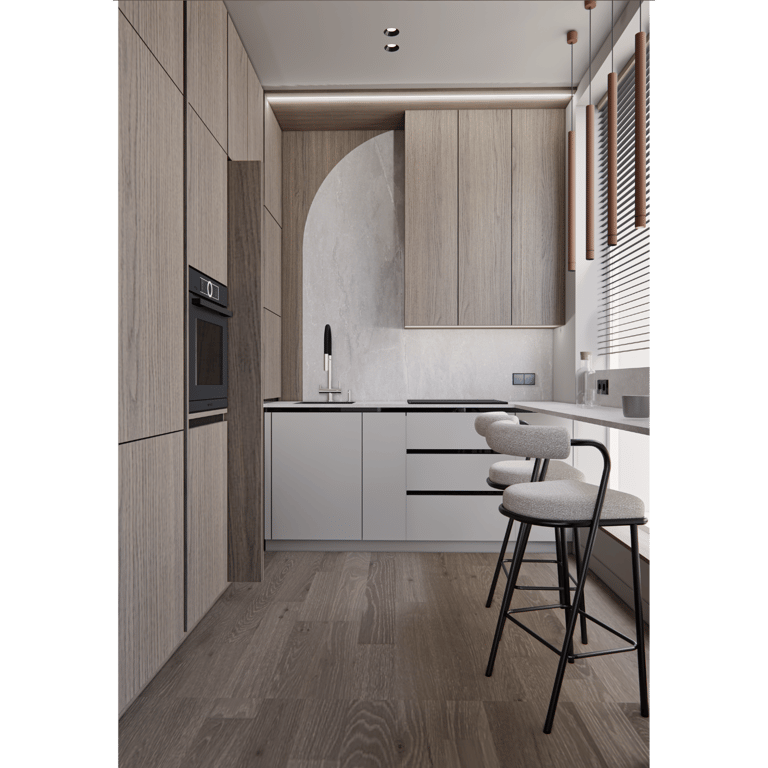Interjeras išsiskiria šilta žemės tonų palete, kurioje dominuoja natūrali mediena, šviesūs neutralūs atspalviai ir viena stipriausių detalių – plytų terakotos spalva. Šis ryškesnis akcentas subtiliai įkomponuotas sienų plokštumose ir balduose, suteikdamas erdvei charakterio bei vizualinės energijos. Lenkta forma ir arkos motyvas tampa pagrindine kompozicine ašimi – jie pasikartoja nišose, balduose ir sienų sprendimuose, kurdami vientisą bei atpažįstamą interjero ritmą.