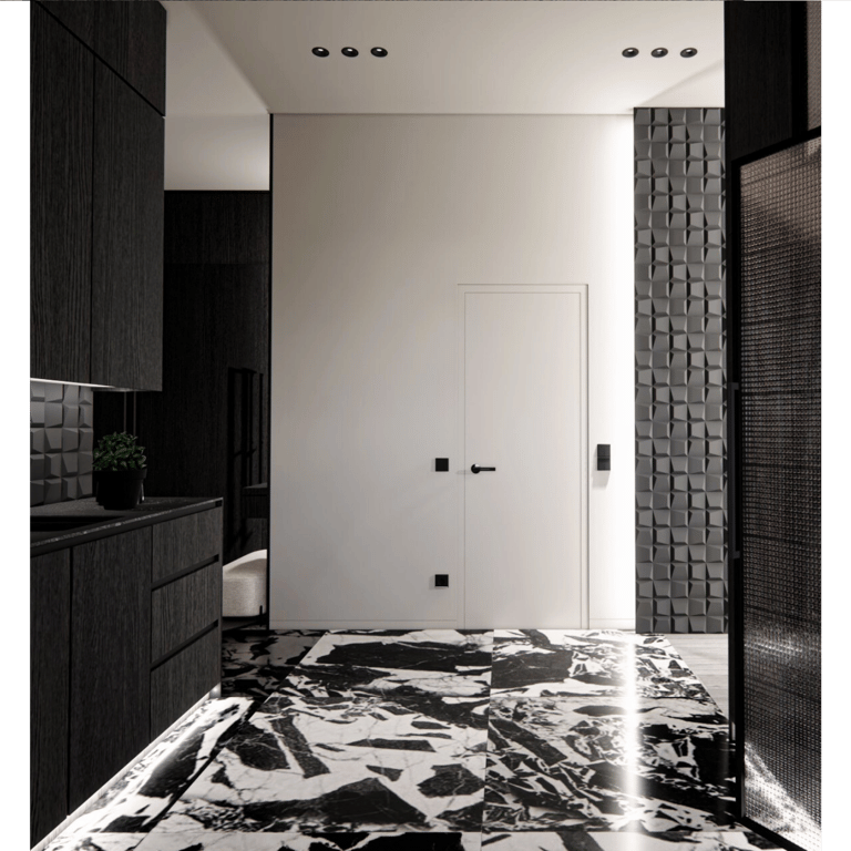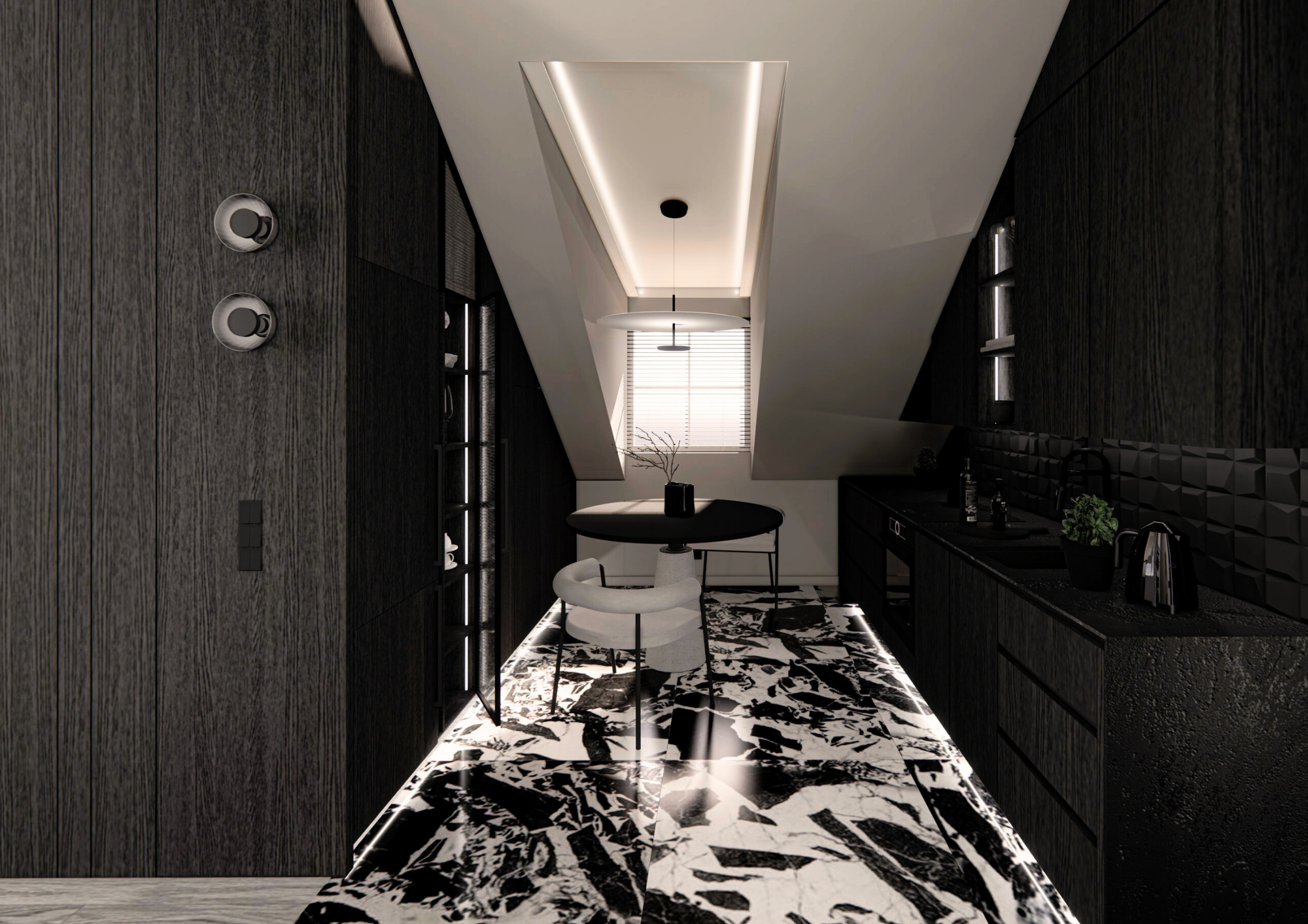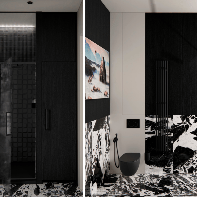 Menas interjere tampa ne dekoracija, o kompoziciniu centru – paveikslas tamsios sienos fone sustiprina erdvės dramaturgiją ir estetinę kryptį. Virtuvės, vonios ir bendrosios zonos išlaiko tą pačią monochrominę stilistiką, kurioje dominuoja juodos, baltos ir grafito tonų dermė. Tai modernus, išraiškingas interjeras, kuriame tekstūrų sluoksniai ir aiškūs kontrastai kuria stiprų, vizualiai gilų charakterį.