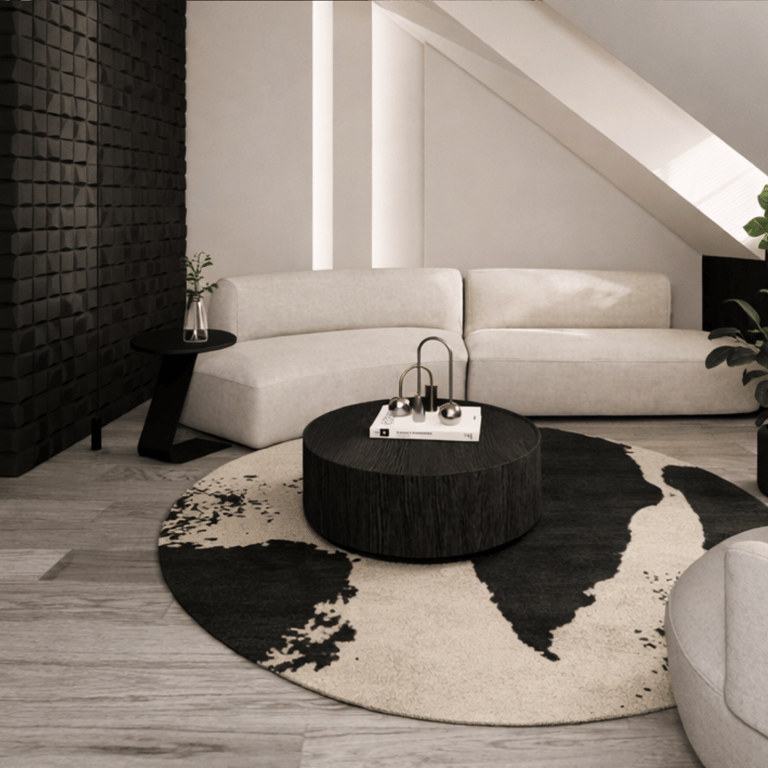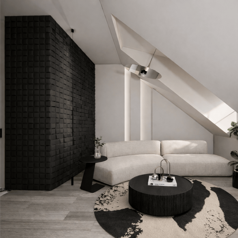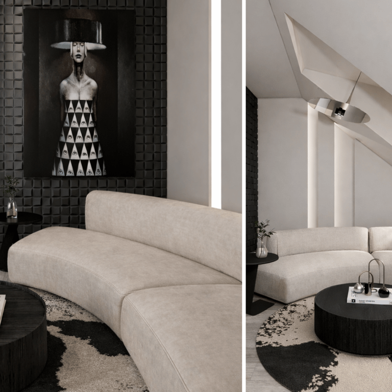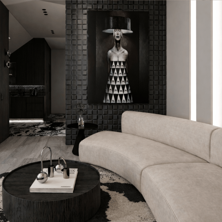 Interjeras kuriamas kontrasto principu – šviesios plokštumos susitinka su sodriais juodais paviršiais, o grafiškas marmuro raštas tampa stipriu vizualiniu akcentu. Tamsi, faktūrinė sienų apdaila ir vertikalios medžio tekstūros suteikia erdvei gylio bei charakterio, o švelni, kreminė sofa įneša balansą ir minkštumo. Apvalios formos – kavos staliukas, kilimo kompozicija, lenkti baldų siluetai – sušvelnina griežtesnę architektūrą ir sukuria harmoningą visumą.