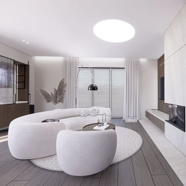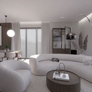 Interjeras sukuria ramią ir harmoningą atmosferą, kurioje vyrauja šviesūs tonai, apvalios linijos ir elegantiški minimalistiniai sprendimai. Erdvėje dominuoja kreminės, švelniai pilkos ir šiltos žemės spalvos, kurios suteikia natūralumo bei švelnumo jausmą. Kiekviena detalė atrodo gerai apgalvota, kad sukurtų subalansuotą ritmą tarp funkcionalumo ir estetinio patrauklumo.